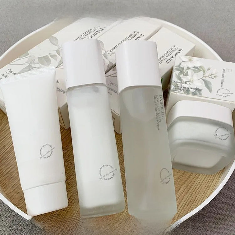Camellia Yeast Hydrating Skincare Set featuring toner, emulsion, cream, and amino acid cleanser to support deep hydration, gentle cleansing, and skin firmness. Suitable for all skin types.
