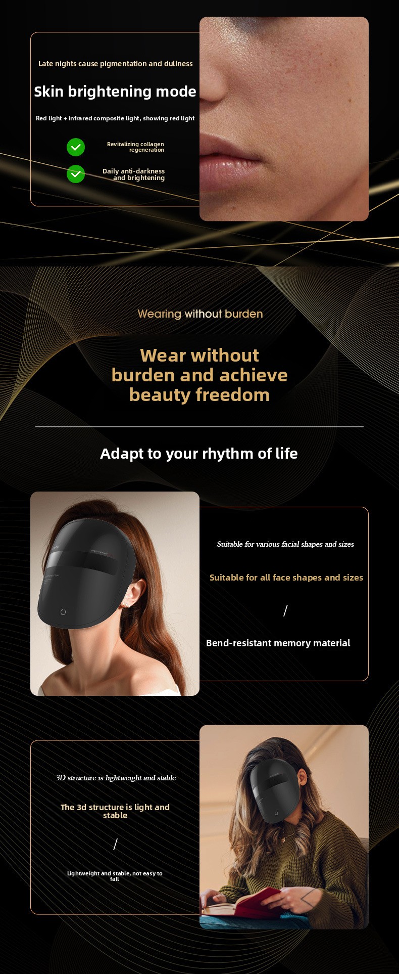 The gear levels allow you to adjust light intensity for comfort and preference during skincare sessions.